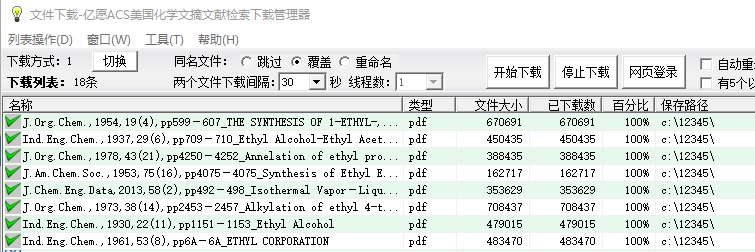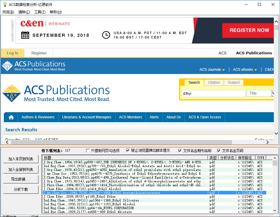 资料的检索、下载、整理、收集、管理 是一件很耗时的工作,“亿愿ACS美国化学文摘文献检索下载管理器”专业下载和管理美国化学学会化学文摘的英文pdf资料,可以让您节省大量的时间和精力,让您把时间花在科研上。亿愿ACS美国化学文摘文献检索下载管理器(YYACSDown)的作用就是针对ACS网站,批量下载检索到的英文资料,过滤掉不需要的文章,资料种类是PDF全文,适合于收集与自己的科研领域相关的资料,分类存放,大大节约下载的时间,给离线浏览PDF文件提供了很大的方便。